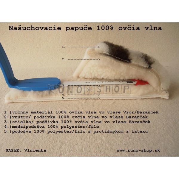 Papuče vyrobené zo 100% ovčej vlny MERINO, ktorá má termoregulačné vlastnosti. Umožňujú pokožke voľne dýchať, vytvárajú príjemný pocit tepla a dokonalú izoláciu. Zmierňujú napätie a bolesti nôh. Sú vhodné pre reumatikov a ľudí, ktorí trpia tzv. pocitom studených nôh. Ale hlavne sú mäkučké, teplučké a komfortné na nosenie.